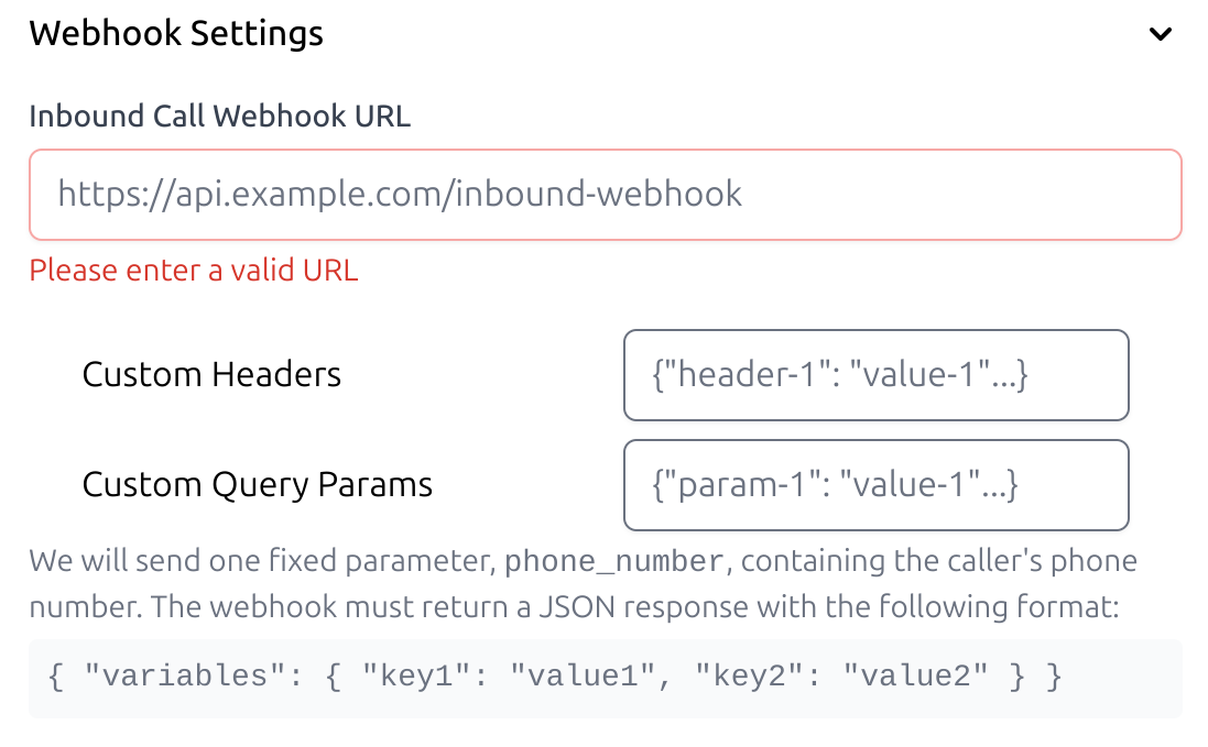 This guide will help you integrate and set up webhooks for inbound AI-powered calls. It explains how to configure webhook settings, set up an API receiver, and dynamically replace variables in AI-generated prompts.